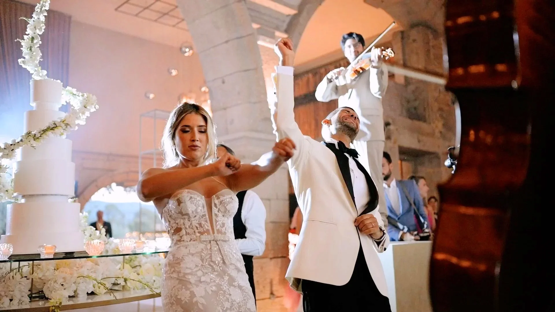 A entrada na sala foi preparada pela Belcanto, com uma introdução absolutamente impactante para os noivos. A decoração da sala estava deslumbrante — como já é imagem de marca da Quinta do Sol do Allevada.Entre discursos, brindes e muita celebração, seguimos para um dos momentos mais icónicos deste espaço: o corte do bolo com a cascata da Quinta do Sol do Allevada. Um cenário único, acompanhado pelos violinos da Belcanto e por um espetáculo de fogo de artifício que elevou ainda mais a emoção.