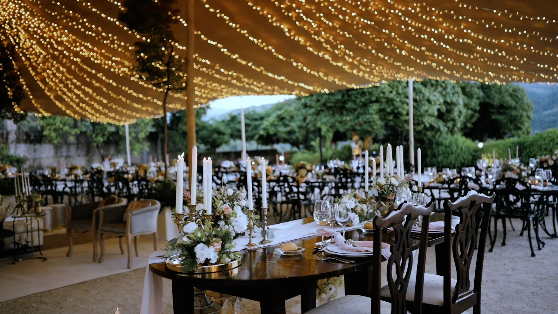 O jantar decorreu numa tenda exterior, criando um ambiente sofisticado mas descontraído, perfeitamente integrado na natureza envolvente. Mais tarde, já com a primeira dança, entrámos oficialmente na noite — e a partir daí foi entrega total até ao último minuto.
